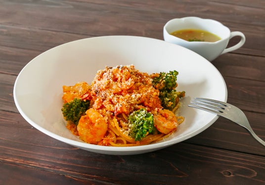 エビとブロッコリーをトマトクリームソースで仕上げたクリーミーな冬のパスタ。まろやかなコクのトマトクリームソースは、濃厚で贅沢な味わいです。