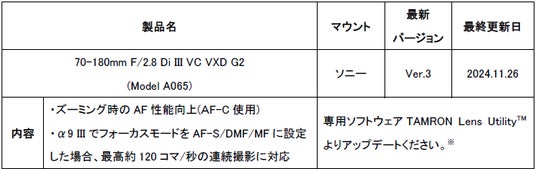 総合光学機器メーカーの株式会社タムロン(代表取締役社長:桜庭省吾、本社:さいたま市)は、タムロン「70-180mm F/2.8 Di III VC VXD G2 (Model A065)」ソニー Eマウント用のレンズファームウェアがアップデートしますことをご案内申し上げます。