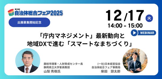 一般社団法人日本経営協会(本部事務局:東京都渋谷区、会長:高原 豪久)は、「自治体総合フェア2025」の出展募集開始を記念して、無料オンラインセミナー「『庁内マネジメント』最新動向と地域DXで進む『スマートなまちづくり』」を12月17日(火)14~15時で開催いたします。