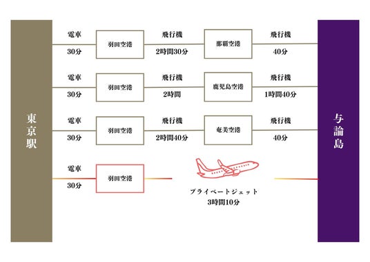 本プランのプライベートジェットは、羽田空港、宮崎空港および鹿児島空港のいずれかの空港から、与論空港までの直行便をご用意しております。与論空港到着後は、プリシアリゾートヨロンとの提携により、スムーズにホテルに直行し、そのまま滞在をお楽しみいただけます。