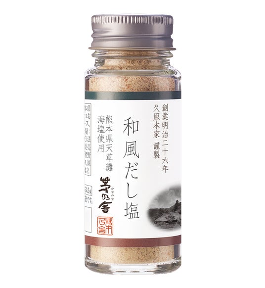 まろやかなうまみの海塩に、茅乃舎だしと同じ鰹節・うるめいわし・焼あご・真昆布を加えた、和風調味塩です。