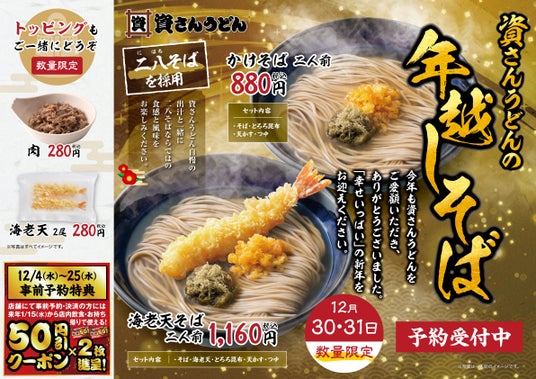 「資さんうどん」では、毎年ご好評いただいております、お持ち帰り専用「年越しそば」のご予約受付を12/4(水)~開始いたします。今年の「年越しそば」には、事前予約で嬉しい特典付き!「年越しそばセット」1セットにつき、年明け1/15(水)~店舗でご利用いただける50円クーポンを2枚をお付けします。