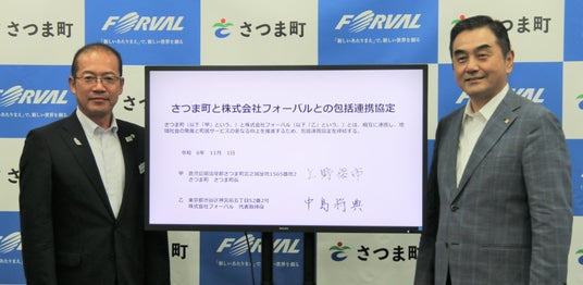 『「新しいあたりまえ」で、新しい世界を創るFORVAL』を理念に掲げ、ESG経営を可視化伴走型で支援する次世代経営コンサルタント集団の株式会社フォーバル(本社:東京都渋谷区、代表取締役社長:中島 將典、以下「フォーバル」)は、11月1日(金)に鹿児島県さつま町(町長:上野 俊市、以下「さつま町」)と包括連携協定を締結いたしました。本締結式は、フォーバル初となる電子署名を用いたペーパーレス締結式となりました。フォーバルは、この包括連携協定を通して、さつま町の地域課題の解決と活性化への貢献を目指します。