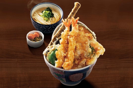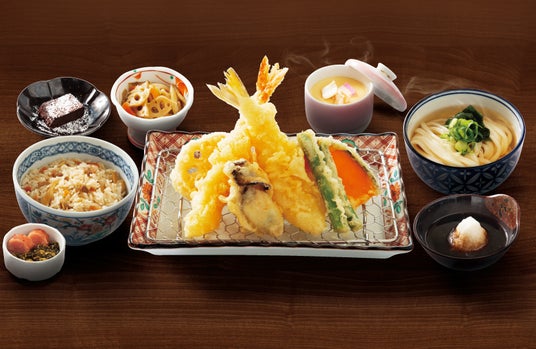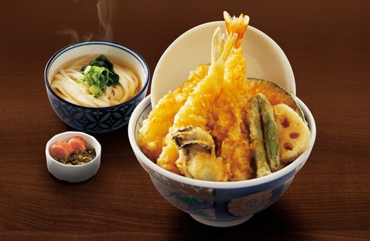 限定天丼セット。うどん又はそばと一緒にお楽しみください。