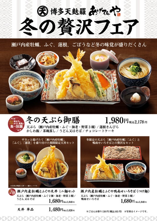 愛知県名古屋市、静岡県浜松市、広島県広島市、大分県中津市に各1店舗を展開している、サクッと香ばしく揚げた天ぷらが自慢の「あげてんや」では12月4日(水)より期間限定で「冬の贅沢フェア」メニュー3種類を開始します。大粒でぷりぷりの瀬戸内産牡蠣やふぐ、蓮根など季節の旬な食材を揃えました。また、せいろそばなどとのセットメニューもございます。ご飯付きメニューは明太子およびからし高菜食べ放題サービスもございます。心ゆくまで、この贅沢メニューをご堪能ください。皆様のご来店をスタッフ一同お待ちしております。何卒よろしくお願い申し上げます。