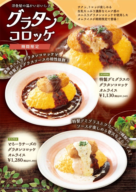 こだわりの「卵」を職人の手仕事で調理し、「卵」そのものの美味しさを丁寧に引き立てる、ふわとろオムライスの「おむらいす亭(レストラン店舗)」では12月4日(水)より期間限定で冬のメニュー2種類を販売いたします。濃厚なミルク感のカニ入りグラタンコロッケをオムライスの上に添え、特製デミグラスソースで仕上げました。また、このメニューに、とろーりチーズとクリームソースも加えた、美味しさ更にアップの贅沢メニューもございます。サラダ付きで提供したします。どうぞ、この機会にご利用ください。皆さまのご来店をスタッフ一同お待ちしております。