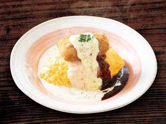 濃厚カニ入りグラタンコロッケに、とろーりチーズ、特製デミグラスとクリームの2種類のソースが楽しめる期間限定の贅沢なオムライスです。