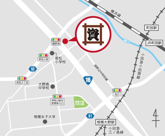 「資さんうどん相模大野店」は、国道16号線沿い「鵜野森」交差点からすぐの場所に位置します。最寄り駅となる小田急小田原線と江ノ島線が乗り入れる「相模大野駅」、JR横浜線「町田駅」周辺には商業施設が集積しており、都心からのアクセスも良好な立地です。平日のランチタイムなどの日常使いはもちろん、週末のお出かけ時のお食事など、様々な用途で便利にご利用いただけます!