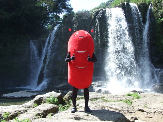 写真:桐原の滝とそお星人/提供:曽於市商工観光課