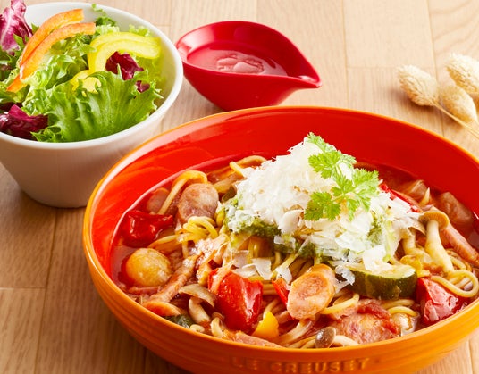 もっちり食感が楽しめる生パスタと、しめじや玉ねぎなどの野菜がたっぷり入った、心も体も温まるトマトスープ仕立てのパスタです。