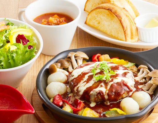 お食事では、心も身体も温まる野菜たっぷりのスープパスタや、濃厚で彩り鮮やかな煮込み風ハンバーグも見逃せません。