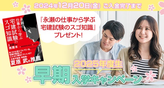 宅建試験受験生応援として、2024年12月20日(金)までに2025年度(令和7年度)宅地建物取引士講座 対象コースご入学で書籍『永瀬の仕事から学ぶ宅建試験のスゴ知識』を無料進呈する「早期入学キャンペーン」を開催中です。