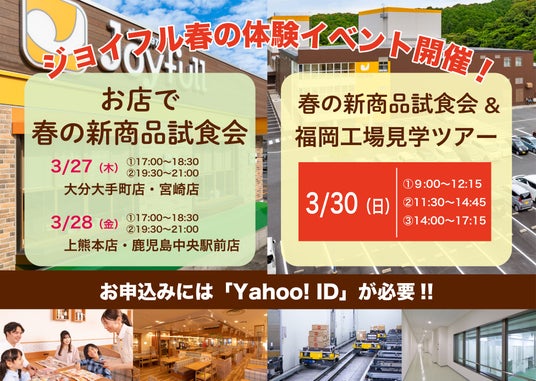 株式会社ジョイフル ファミリーレストランチェーン「ジョイフル」を展開する株式会社ジョイフル(本社:大分県大分市 代表取締役社長:穴見くるみ)は、3月27日(木)・3月28日(金)に「店舗での春の新商品試食会」、3月30日(日)には「春の新商品試食会&福岡工場見学ツアー」を開催いたします。