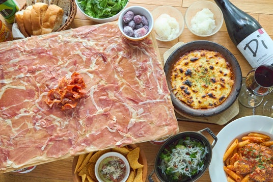 1.看板メニューのテーブルいっぱいに広がる生ハムてんこ盛りをはじめとする、サクっと飲みからお腹いっぱい食べたい方まで満足いただける40種類以上のお食事