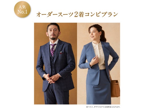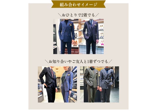※コンビプランとは・・・オーダースーツ2着以上ご購入していただいた場合の1着あたりのお値段です。組み合わせは自由ですので、異なる価格帯のオーダースーツと組み合わせていただいても本価格が適用されます。