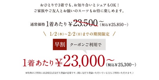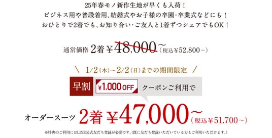 春モノ新作×オールシーズンモノ×ビジネス×礼服、メンズ、レディースなど、お好きな組み合わせでオーダーが可能です。また、お知り合いやご家族と1着ずつのオーダーでもフェア適用となります。