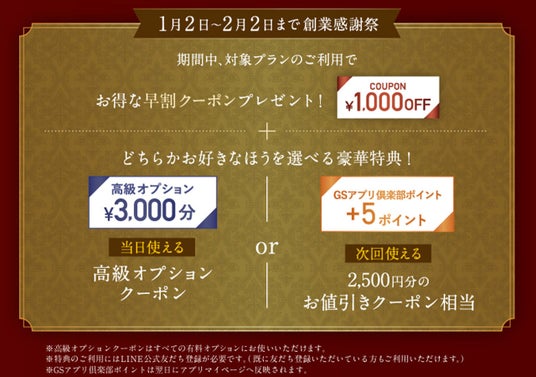 1月2日 (木)から2月2日(日)までの期間中、対象プランをご利用のお客様に早割クーポンをプレゼント。さらに、高級オプション3,000円分またはGS倶楽部ポイント5ポイント(2,500円相当)のどちらかをお選びいただけます。