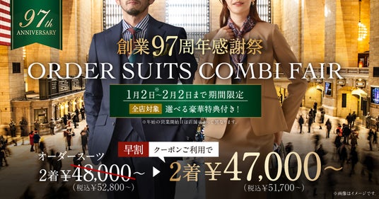 オーダースーツ専門店「グローバルスタイル」を運営するグローバルスタイル株式会社(東京証券取引所 スタンダード市場:7126、本社:大阪市中央区、代表取締役社長 田城弘志)は、2025年2月に創業97周年を迎えます。それに先駆け、感謝の気持ちを込めてグローバルスタイル全店でお得な創業感謝祭を開催します。