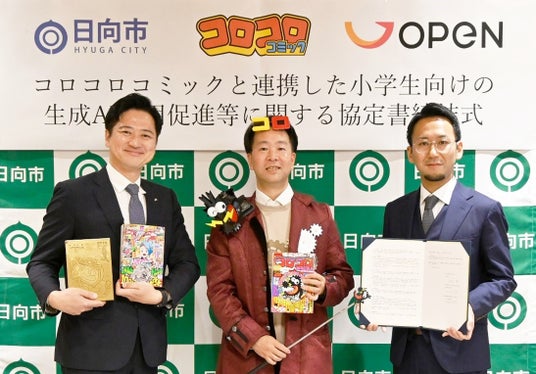 オープングループ株式会社(本社:東京都港区、代表取締役:高橋 知道)の子会社で、「ヒトの進化を共創する」をミッションに掲げるオープン株式会社(本社:東京都港区、代表取締役執行役員社長:石井 岳之、以下「オープン」)は、株式会社小学館が提供する「コロコロコミック」とともに、宮崎県日向市(市長:西村 賢)と包括連携協定を結び、生成AIなどITが進化する社会で子どもがより楽しく学ぶことができる「親子での学びの場」となる教育プロジェクトを実施することを発表いたします。