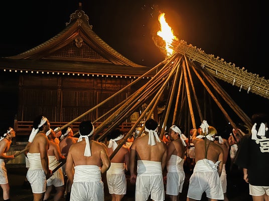 筑後地区観光協議会【福岡県筑後市】 筑後市熊野神社に伝わる福岡県無形民俗文化財指定の火祭り「鬼の修正会(しゅじょうえ)」は、地域の祭りに触れる貴重な体験の機会として、大松明神事を支える男性参加者を募集します。