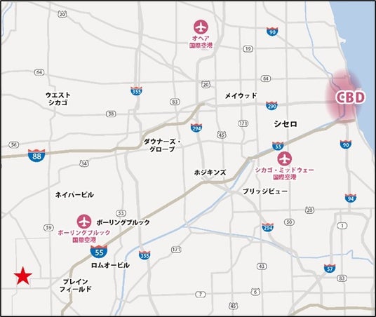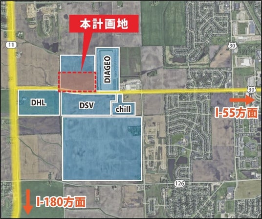 イリノイ州シカゴ都市圏は、東海岸・西海岸の主要都市をつなぐ州間高速道路、貨物鉄道、米国の航空貨物の玄関口の一つであるシカゴ・オヘア国際空港などの物流インフラが整っていることから、米国中西部の物流集積地となっており、物流ストック量は全米1位(約11億sqf)を誇ります。本計画地は、シカゴCBDから南西に60km、近年物流施設が集積するFar South West Suburbsのエリア内に位置し、州間高速道路「I55」及び「I80」へのアクセスが良好なことから、ECや生活消費財などの保管倉庫や配送センターとしての物流ニーズに適した立地となっています。