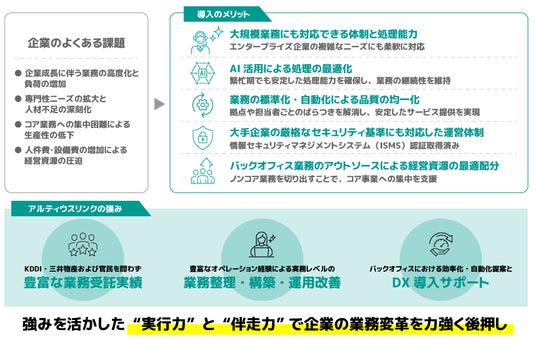 アルティウスリンクは、KDDIと三井物産の共同出資会社です。多様な人財とグループのアセットを活かし、コンタクトセンター、バックオフィス、営業支援、ITソリューションなど、企業活動を支える包括的なBPOサービスをワンストップで提供しています。 人による高付加価値なオペレーションに、生成AIなどの先端テクノロジーと高度なデータ活用を掛け合わせることでBX(ビジネストランスフォーメーション)を推進し、企業の競争力強化を支援しています。
