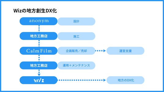 「anonym(アノニム)」による設計、「地方工務店」による施工、「Calm film(カームフィルム)」による施設の運営支援・企画販売、「地方工務店」による運用・メンテナンス、Wizによる地域DX化というフォーマットを確立させ、新しい地方創生モデルを提案していきます。 そして、核となるホテル・民泊事業を全国展開させるべく、ホテル「霞燦(カサン)」「 靄居(モヤイ)」「相相(ソウソウ)」を起点に地域の魅力を最大限に引き出してまいります。