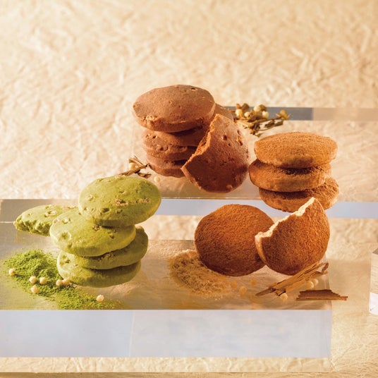 さくさくと歯ざわりのよいぶぶあられと、細かく砕いたローストアーモンドを生地に混ぜて焼き上げた、ほろっと口の中で溶けていくひと口サイズの焼きショコラ。[宇治抹茶]、[ほうじ茶]、[きなこ&シナモン]の3種類を詰め合わせました。