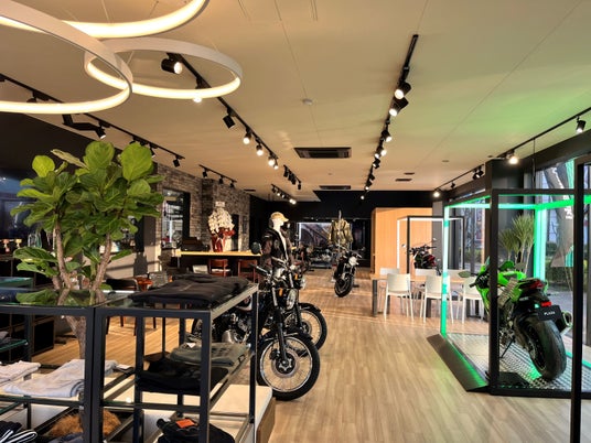 木目調のフロアと白い天井が織りなす明るい店内。モーターサイクルとプラザアパレルがゆったりと展示され、どなたでも楽しめる空間としています。