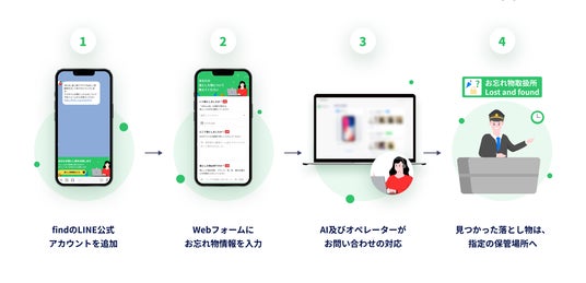 「落とし物クラウドfind」は、LINEやAIを活用した、落とし物の返却サポートサービスです。当サービスの導入により、電話やメールのみならず、LINEでも気軽に落とし物のお問い合わせができるようになります。また、落とし物の画像からAIが情報を収集することで、より正確で迅速なお忘れ物の照合ができるようになり、返却までの時間短縮や返却率の向上、ならびに従業員の検索業務の負担軽減を実現します。
