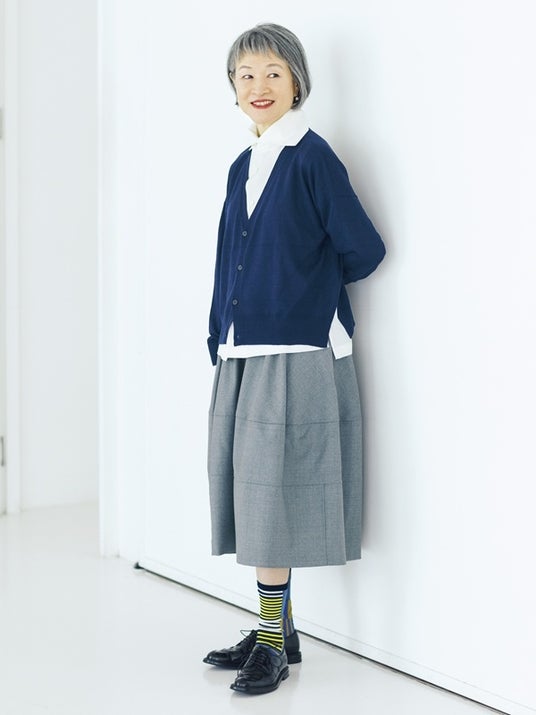 バルーンシルエットのスカートに、シルクのブラウスとシルクカシミヤのカーディガンを合わせた、レティーライクなコーディネート。ボーダーの靴下をアクセントに。