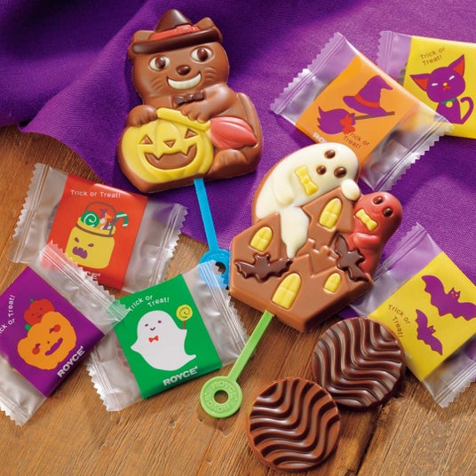 カラフルでキュートな表情の「キャット」&「ゴースト」のロイズポップチョコと、ハロウィン限定デザインの個包装に入ったピュアチョコレートをセットに。ハロウィンのちょっとした手土産や、お子さまへのプレゼントにもおすすめです。