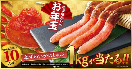 株式会社物語コーポレーション(本社:愛知県豊橋市/代表取締役社長:加藤 央之)が全国100店舗を展開する『寿司・しゃぶしゃぶ ゆず庵』(以下、ゆず庵)は、「本ずわいがに かにしゃぶ」の販売を記念して、2024年12月28日(土)より、本ずわいかにしゃぶ1kgが当たるプレゼントキャンペーンを開催いたします。