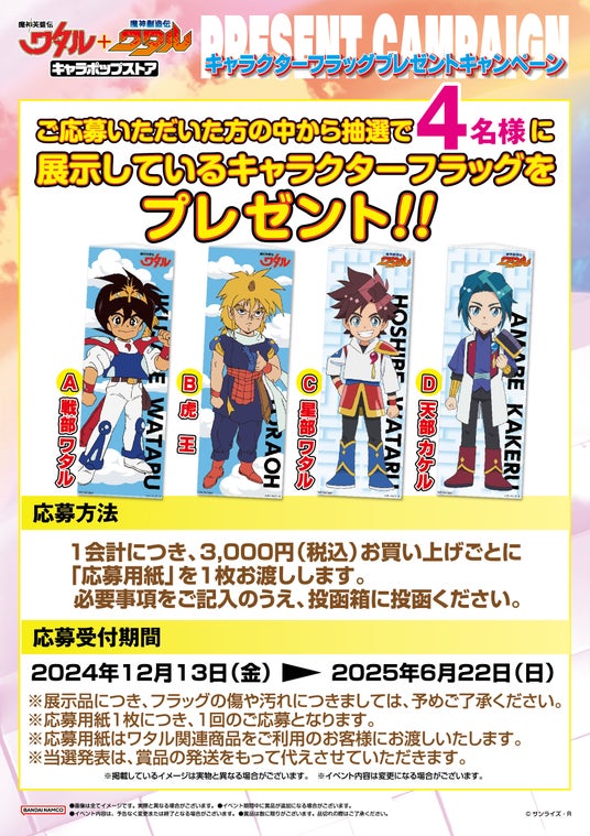 イベントショップ内に展示したキャラクターフラッグを抽選で4名さまにプレゼントするキャンペーンを実施します。