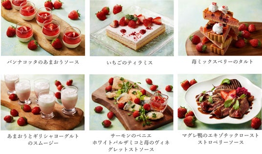 本フェアでは、旬のいちごをたっぷりと贅沢に使ったデザートから、料理にいちごを取り入れた斬新なお食事メニューまで多種多様ないちごグルメをご提供いたします。いちご狩り気分で好きなだけ味わえるいちごの食べ放題をはじめ、甘酸っぱい「あまおう」とミルキーなパンナコッタが溶け合う「パンナコッタのあまおうソース」やシェフがその場でクリームを絞ってご提供する「ストロベリーモンブラン」、ティラミスやタルトなどのケーキ系まで、デザートメニューは充実のラインアップ。衣をつけパリッと揚げたサーモンにいちごとホワイトバルザミコの酸味がアクセントになった「サーモンのベニエ ホワイトバルザミコと苺のヴィネグレットストソース」やエキゾチックなスパイスでマリネしたフォアグラ用の鴨をローストしたリッチな味わいが楽しめる「マグレ鴨のエキゾチックロースト ストロベリーソース」など、新しいいちごの味わい方が発見できるお食事メニューもご用意しております。