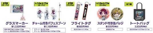 コラボオリジナルグッズ、「アクリルグラスマーカー【全9種/オープン】」「チャーム付きパフェスプーン【A:14種・B15種/オープン】」「スタンド付き缶バッジ【A:14種・B15種/ランダム】」「フライトタグ【全9種/ランダム】」「トートバッグ【全1種】」を、JOYSOUND 直営店10店舗の店頭販売及び、オンラインストア(完全予約制)で販売!