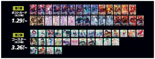 注文特典として、オリジナルノベルティ【全58種:第1弾ポストカード29種/第2弾コースター29種】の中から、コラボドリンク1品ご注文につき1枚プレゼント!