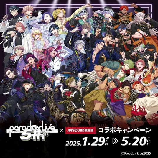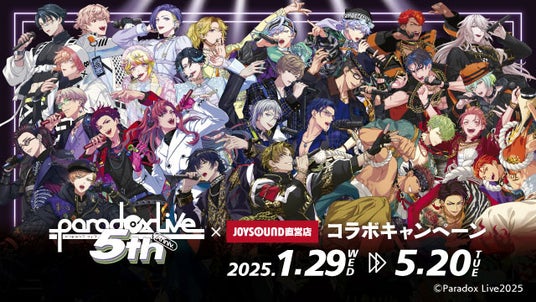 株式会社エクシングの子会社で、全国にカラオケ店舗・ネットカフェ店舗を展開する株式会社スタンダード(本社:東京都港区、代表取締役社長:米田洋一)は、2025年1月29日(水)から2025年5月20日(火)までの期間中、「Paradox Live 5th Anniversary×JOYSOUND直営店コラボキャンペーン」と題し、JOYSOUND池袋西口公園前店・JOYSOUND渋谷南口駅前店(東京)・JOYSOUND名駅三丁目店(愛知)・JOYSOUNDなんば戎橋店(大阪)・JOYSOUND博多口駅前店(福岡)の5店舗にカラオケコラボルームをオープン!また、JOYSOUND直営店67店舗とゆう遊空間3店舗にて、オリジナルノベルティ付きコラボメニューを展開します。