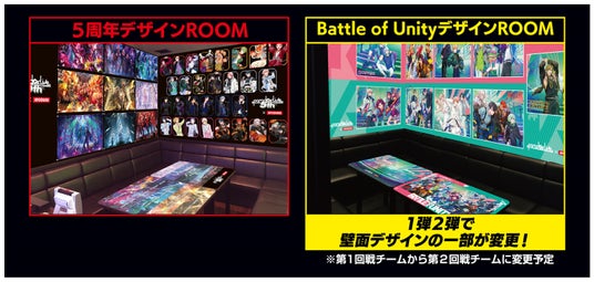 カラオケコラボルームのデザインには、「5周年デザイン」「Battle of Unityデザイン」の2パターンをご用意し、ルーム内の壁面やテーブル、ドアに至るまで、「Paradox Live」の世界観で彩り、ファンには堪らない空間となっております。また「Battle of Unityデザイン」ルームは、1弾2弾で壁面デザインの一部が変更に!