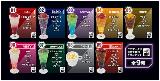 コラボドリンクは、「Paradox Live」の各グループ「BAE」「The Cat’s Whiskers」「cozmez」「悪漢奴等」「武雷管」「VISTY」「AMPRULE」「1Nm8」「獄Luck」をイメージした全9種【各750円(税込)】をご用意します。注文特典として、オリジナルノベルティ【全58種:第1弾ポストカード29種/第2弾コースター29種】の中から、コラボドリンク1品ご注文につき1枚プレゼント!さらに、コラボフード「Paradox Liveバトル応援スナックラップ」【880円(税込)】もご用意!コラボフード「Paradox Liveバトル応援スナックラップ」には、注文特典としてランチョンマットとしおり【各2種:第1弾1種/第2弾1種】もついてきます。