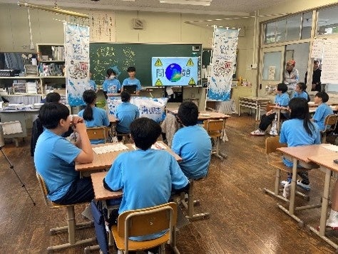 後半は場所を教室に移動。これまでの学習を経て児童19人で話し合って最後にまとめたメッセージは、「美しい海を残そう!」でした。これをキーワードに「海と日本・上南方美海(びかい)プロジェクト」と銘打ち、テーマ別にまとめた学習内容を発表しました。