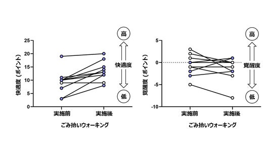 2.気分の変化:ごみ拾いウォーキング後に、10名の参加者のうち9名の方で、快適度の向上が確認されました。