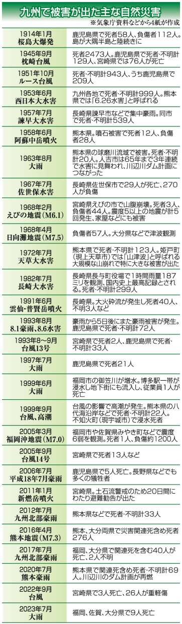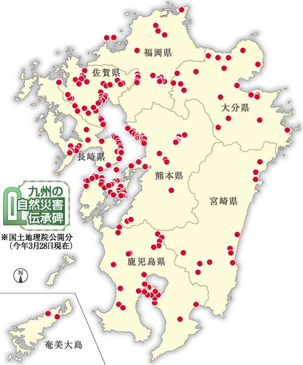 ■災害伝承碑 国土地理院は2019年6月、過去の津波や洪水、土砂災害などを伝える自然災害伝承碑の地図記号の使用を開始した。今年3月28日時点で全国に2099基あり、市区町村からの申請を受けておおむね月に1回、追加。ウェブサイトで公開している。九州7県では221基が登録されており、内訳は福岡18、佐賀41、長崎27、熊本72、大分21、宮崎13、鹿児島29。