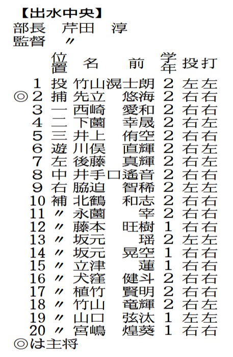 出水中央は、県予選6試合中4試合を逆転勝ちし19年ぶり5度目の九州大会をつかんだ。打線はつなぐ意識が高く、先発の野手陣は全員が安打を放った。準々決勝は延長十回、準決勝は九回に連打でサヨナラ勝ち。終盤の競り合いで粘りを発揮してきた。